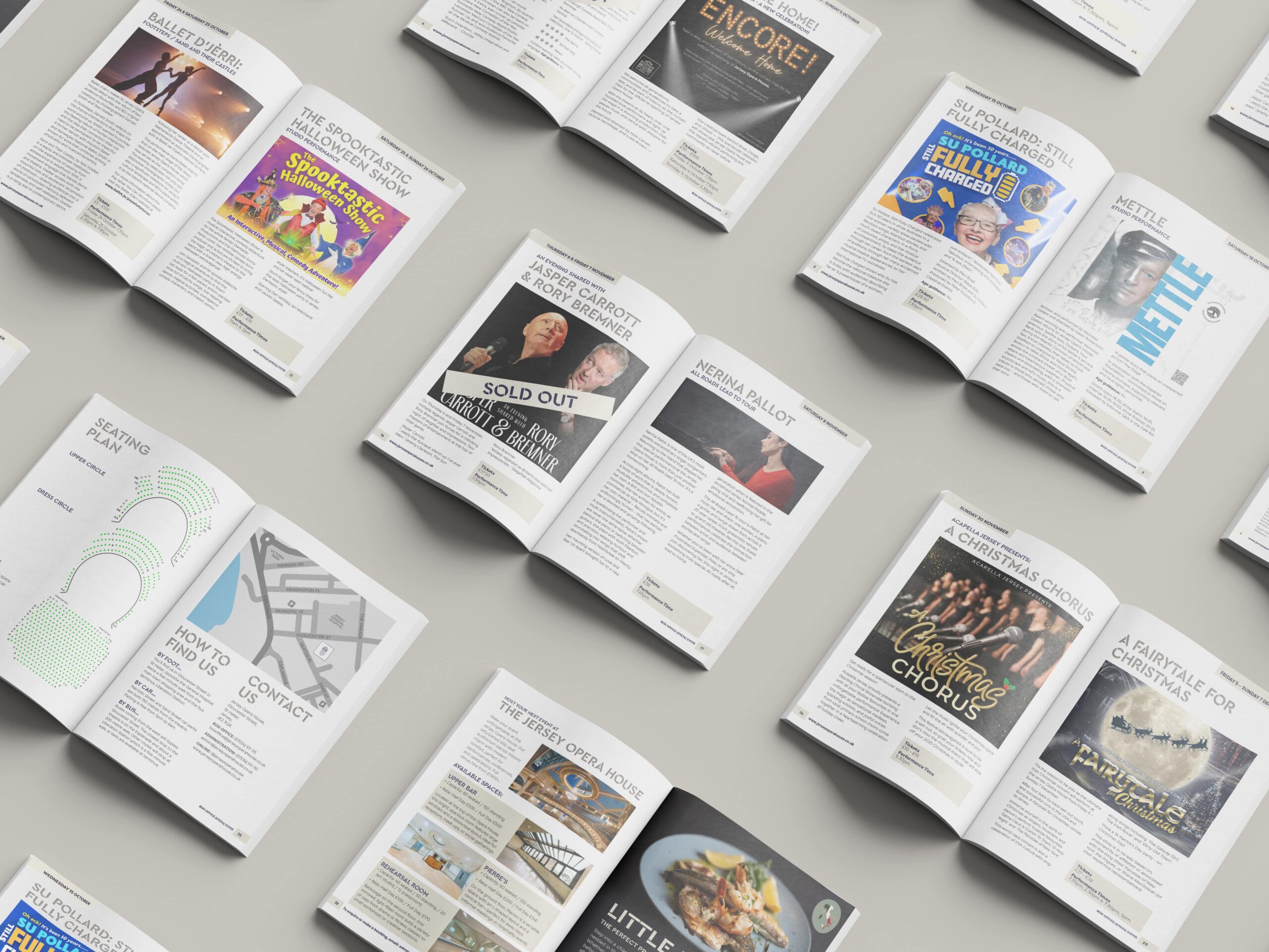 The Graphic Design House had collaborated with Jersey Opera House for several years prior to its closure, producing multiple seasonal brochures each year. In 2025, we were invited to continue this long-standing relationship, supporting the theatre’s reopening by developing a new event brochure.